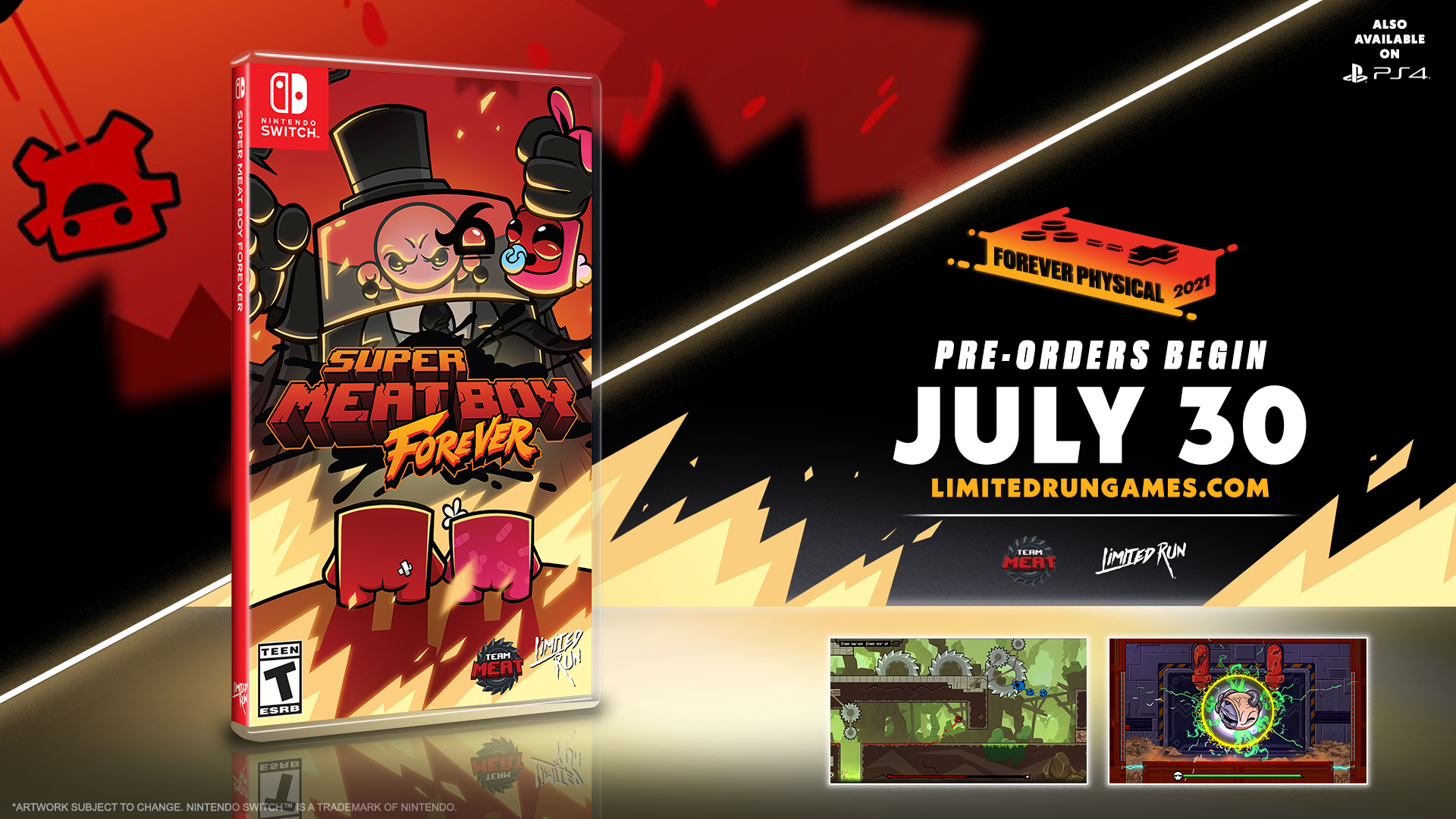 Super Meat Boy Forever is on a region-free physical cart for the Nintendo Switch.