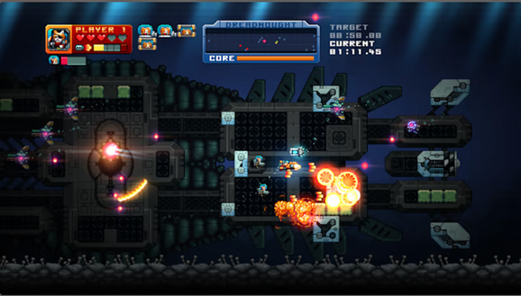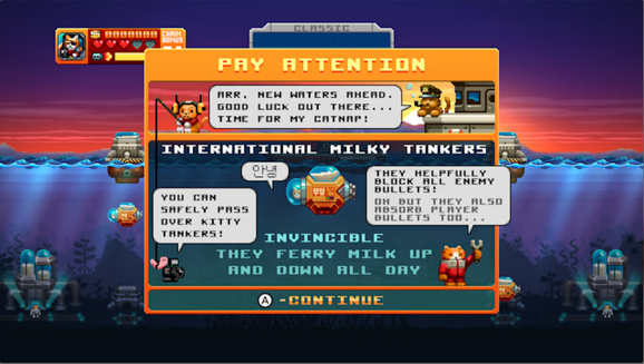 The additional Dreadnought mode takes you deep down into the Meowiana trench. There you must fly through and destroy huge multi-screen enemy craft, whilst rescuing imprisoned kittens.